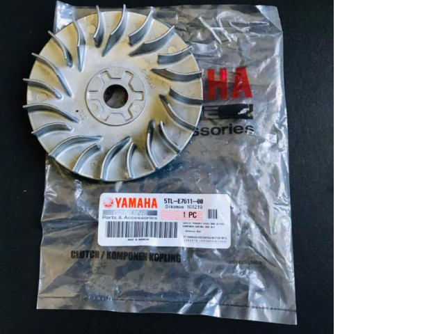 This is a genuine Yamaha fixed primary sheave that appears to be a part of a clutch system for a motorcycle or similar vehicle. The sheave is made from a durable metal with an intricate fin design, which likely contributes to efficient heat dissipation during operation. Its robust construction suggests a long service life and reliability. Presented in original Yamaha packaging, it indicates that the piece is an official replacement part, ensuring compatibility and performance as per the manufacturer's specifications. This specific part may be sought after by motorcycle enthusiasts looking to maintain or repair their Yamaha vehicles with quality components.