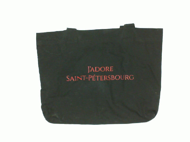 This is a stylish black cloth bag featuring bold red lettering that reads 'J'ADORE SAINT-PÉTERSBOURG'. The contrast of the red text on the black background gives it a striking appearance, making it a fashion statement. It may appeal to those who have a fondness for Saint Petersburg or those who appreciate chic, minimalist accessories. The bag's spacious and uncomplicated design indicates its functionality for a variety of uses such as shopping, carrying personal items, or as an everyday tote.