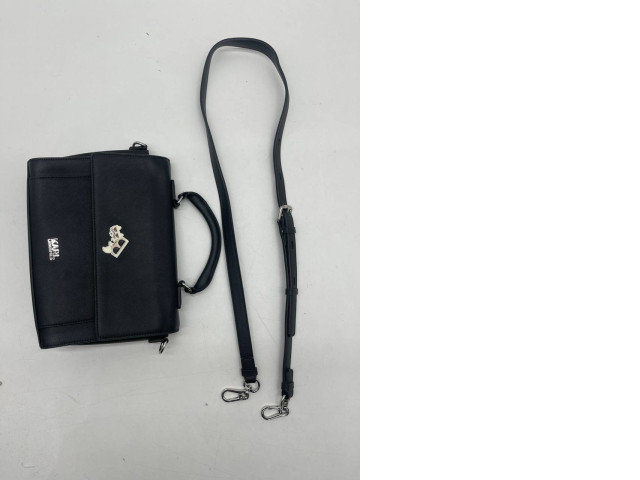 This sleek black bag features a glossy finish that enhances its modern appeal. The prominent white l..