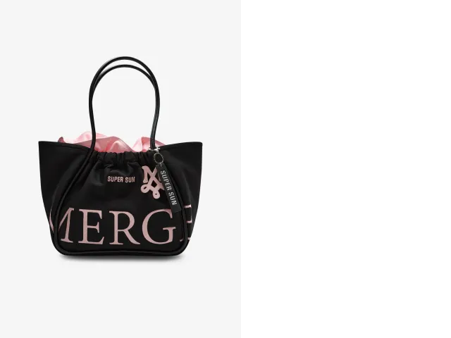 The A DAY BAG – SUPER SUN is a stylish and functional tote that effortlessly combines fashion and practicality. It features a classic black exterior adorned with the eye-catching word 'MERGE' in a soft pink shade, making it a perfect accessory for any outfit. The bag's top is gathered with a drawstring, providing easy access to your belongings while allowing for a customizable shape. The vibrant pink lining adds a playful contrast, enhancing the bag's appeal. With sturdy, comfortable handles, this bag is ideal for everyday use, ensuring you carry your essentials in style.