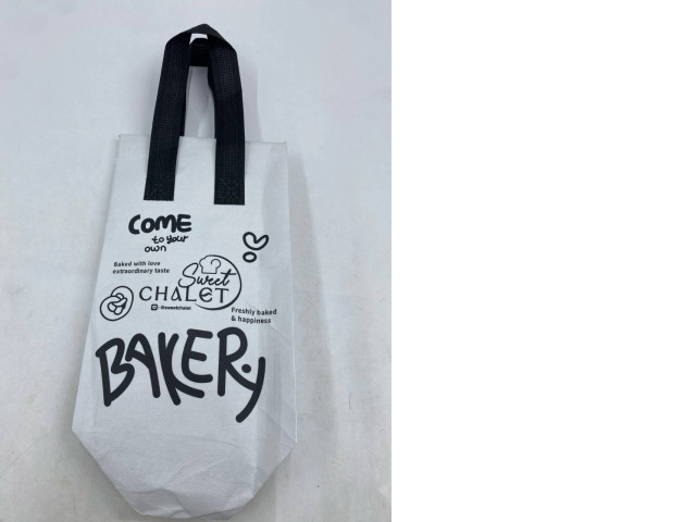 white and black non-woven fabric tote bag with the "Sweet CHALET BAKERY" logo and branding.