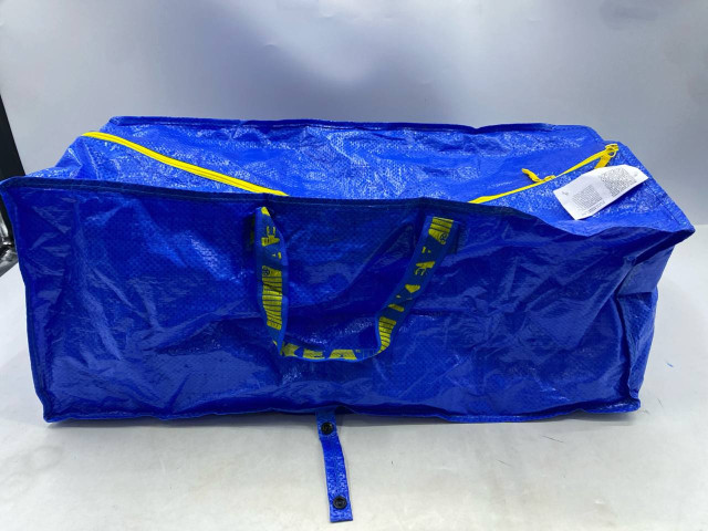 IKEA FRAKTA carrier bag, likely the large size in blue polypropylene with a zipper.