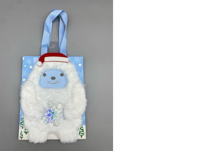 decorative holiday gift bag featuring a plush Abominable Snowman or Yeti character wearing a Santa hat.