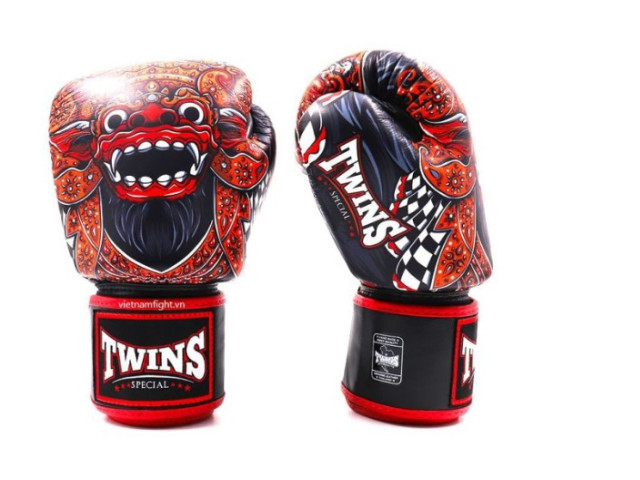These Twins Boxing Gloves FBGVL3-59 are designed with a vivid, eye-catching Hanuman design, representing strength and power in Thai culture. They are crafted from high-quality leather for durability and feature a robust padding system for maximum hand protection. The gloves are equipped with a secure Velcro wrist closure for a snug and adjustable fit. The intricate pattern and bright red and black colors make these gloves not only functional but also visually striking, adding a touch of style to the fighter's gear. Ideal for Muay Thai, boxing, and other martial arts, they are built to withstand rigorous training and sparring sessions.