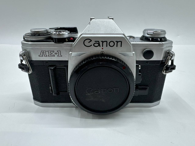 The Canon AE-1 is a 35mm single-lens reflex (SLR) film camera that was introduced in 1976. It is widely regarded as one of the most popular cameras of its time, known for its ease of use and reliability. The camera features an electronically controlled shutter speed that ranges from 1/1000 to 2 seconds, along with a built-in light meter for exposure determination. The interchangeable lenses allow users to explore various photographic styles, and the camera is designed to accommodate a range of Canon FD lenses. Its robust construction and classic design, characterized by a mix of metal and plastic components, provide durability while maintaining a lightweight feel. The AE-1's distinctive silhouette, with its angular lines and sleek finish, makes it an iconic piece of photographic history.