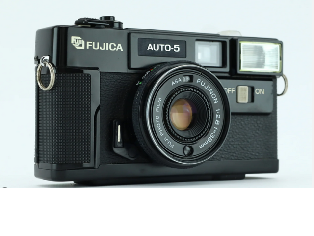 The Fujica Auto-5 is a vintage 35mm film camera known for its compact design and user-friendly features. This camera features a sleek, black body, made of durable materials that give it a classic aesthetic. The lens is a Fujinon 28mm f/2.8, allowing for sharp image quality and excellent low-light performance. The camera's automatic exposure system simplifies the photography process for beginners, making it easy to capture well-exposed photos without manual adjustments. Additionally, the Auto-5 has a built-in flash for enhanced lighting, ensuring versatility in various shooting conditions. Its ergonomic design includes a textured grip, making it comfortable to hold and operate. Overall, the Fujica Auto-5 embodies the charm of analog photography with reliable performance.