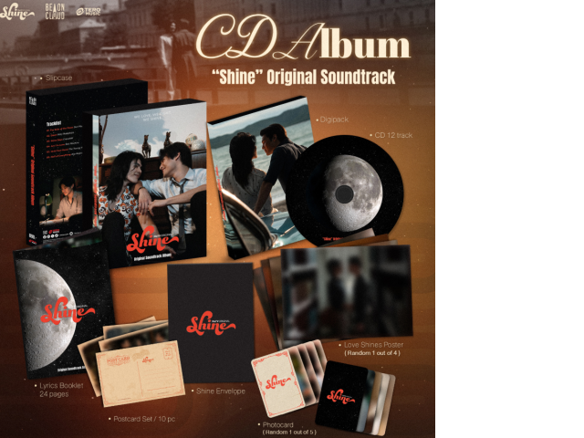 The "Shine" soundtrack album (CD) contains 12 songs from the series. The package includes a slipcase, digipak, a 24-page lyric booklet, a set of postcards, an envelope, and a random poster and photocard.