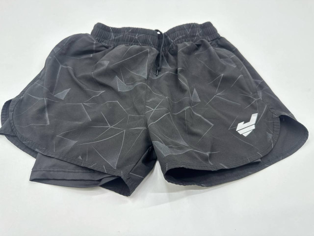 These women's workout shorts are designed for comfort and performance during any fitness activity. Made from a lightweight and breathable fabric, they feature an elastic waistband for a secure fit. The shorts have a stylish black color with a subtle geometric pattern, adding a modern touch to your workout attire. The hem is slightly curved to allow for maximum mobility, making them perfect for running, yoga, or gym sessions. The shorts also have a small logo on the lower side, giving them a sporty aesthetic.