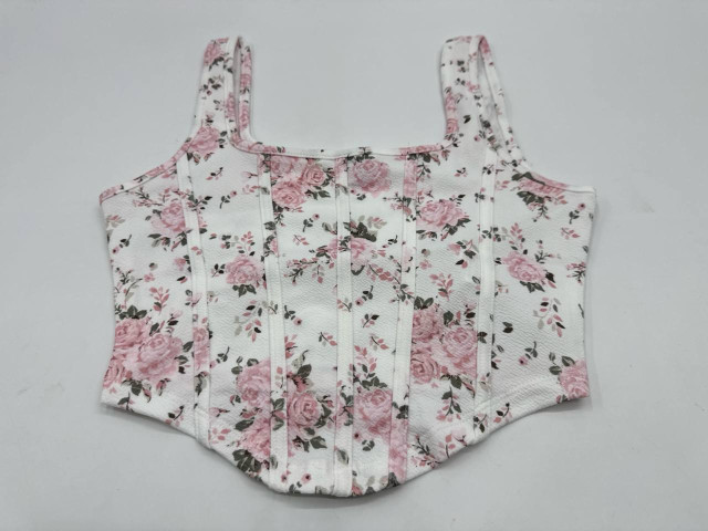 This women's white top features a delicate flower print that adds a touch of femininity and charm. The design showcases a soft fabric, offering both comfort and style. The floral patterns in shades of pink and green contrast beautifully against the white background, making it a perfect choice for casual outings or summer events. With adjustable straps and a fitted silhouette, this top enhances the figure while providing ease of movement. The subtle texture adds depth to the overall look, making it a versatile piece that can be paired with shorts, skirts, or jeans for a chic ensemble.