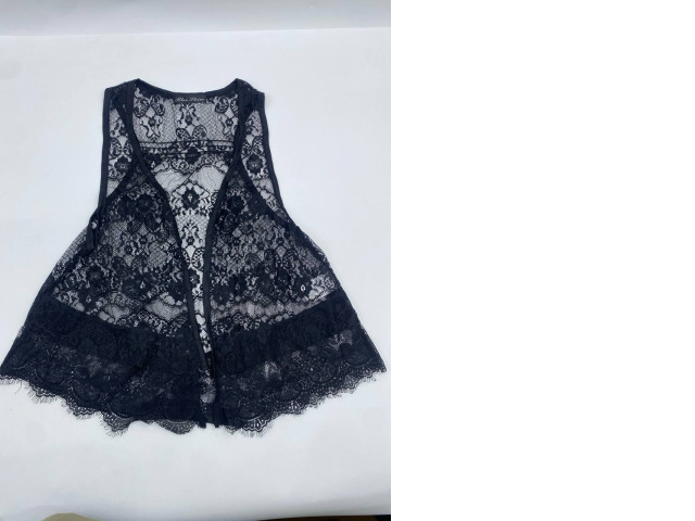 This elegant black lace vest is a sophisticated piece designed for layering. Made from delicate lace fabric, it features intricate floral patterns that add a touch of femininity. The vest has an open front, allowing for versatile styling over tops or dresses. Its sleeveless design provides comfort during warmer days, while the intricate lace detailing offers a chic look for evenings out. The bottom edge of the vest is adorned with scalloped lace trim, enhancing its aesthetic appeal. Perfect for adding a romantic flair to casual outfits or dressing up for special occasions.