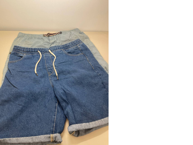 This product features a set of two stylish shorts, perfect for casual summer wear. The first pair is made from soft denim, showcasing a classic blue color with a subtle faded look. They have a relaxed fit, secured with a drawstring at the waist, and feature rolled cuffs for a trendy finish. The second pair is a lightweight fabric in a soft pastel tone, designed for comfort and breathability. It also includes an elastic waistband for easy wear. Both shorts are versatile and can be paired with various tops for effortless style.