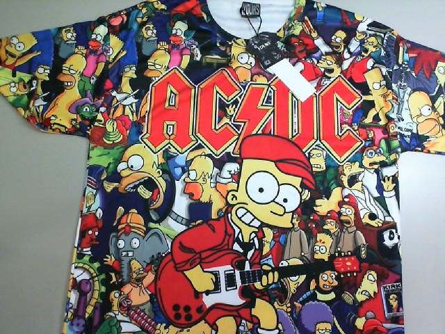 This eye-catching size XL T-shirt features a bold and colorful print that blends the iconic rock band AC/DC with the beloved animated characters from The Simpsons. The lively design covers the entire shirt, showcasing a variety of characters in dynamic poses, with Bart Simpson taking center stage as he plays the electric guitar, reflecting a playful fusion of rock and cartoon elements. The AC/DC logo is prominently displayed in classic red and yellow colors, adding to the shirt's energetic vibe. Made of comfortable material, this T-shirt is not only a fashion statement but also a unique collectible for fans of both the band and the series.