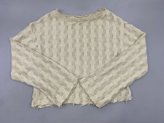 • A sheer beige knitted sweater with distressed details, similar to designs from Zara or Comme des Garçons Homme Plus.
