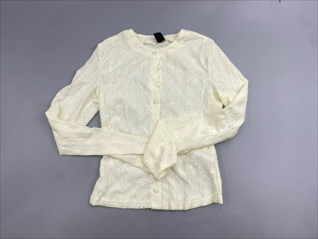 white eyelet or lace-textured cardigan sweater featuring a crew neck and front button closure.