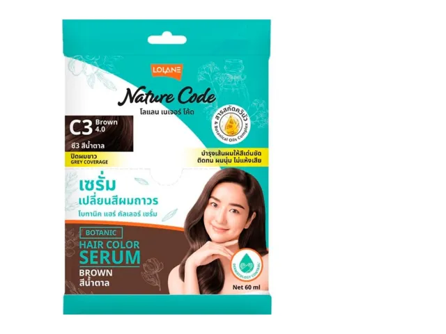 Thai hair dye LOLANE is a botanical hair color serum designed to provide rich and vibrant color while ensuring grey coverage. The product features a striking packaging that highlights its natural ingredients, suggesting gentle and nourishing properties. With a shade labeled C3 Brown (4.0), it promises a deep brown hue that enhances hair's natural beauty. The inclusion of botanical oils focuses on maintaining hair health, making this dye an appealing choice for those looking to achieve beautiful color without compromising on care.