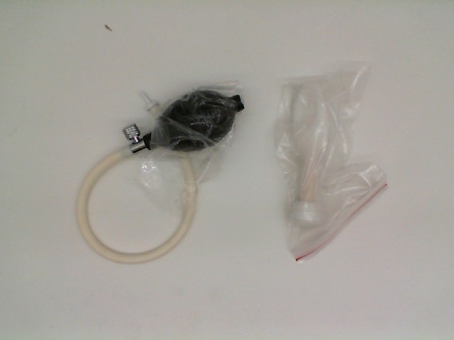 This product is a medical accessory used to manually pump air into the cuff of a sphygmomanometer, commonly known as a blood pressure cuff. The image shows the pump with a rubber bulb encased in black plastic, a tube likely made of latex connecting the bulb to the cuff, and a pressure release valve, which is crucial for controlling the flow of air into and out of the cuff. The cuff itself appears transparent and is designed to wrap around a patient's arm to measure blood pressure. The simplicity and manual operation of the device suggest it is portable and easy to use, making it ideal for home or clinical settings.