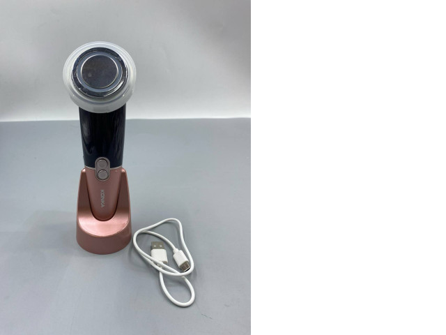 The facial massager is a high-quality skincare device designed to enhance facial beauty and promote relaxation. It features a sleek and modern design with a combination of dark and rose gold colors, making it a stylish addition to any beauty regimen. The head of the massager is circular and is made of smooth metal, ensuring gentle contact with the skin. Its ergonomic handle allows for easy maneuverability during use. The device comes with a charging dock and includes a USB cable for convenient charging. It is perfect for using with serums or moisturizers to boost absorption and improve overall skin texture.
