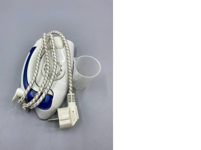 This product is a compact electric iron designed for efficient and effective ironing of clothes. The iron boasts a sleek design with a predominantly white exterior accented by blue elements. It features a durable and flexible power cord, which is braided for added strength and flexibility. The iron has adjustable temperature settings to accommodate various fabric types, ensuring optimal results without damaging delicate materials. A measuring cup is included for easy filling of the water tank, allowing for steam functions that help remove stubborn wrinkles. The device is lightweight, making it easy to maneuver during use, and features a streamlined shape that facilitates easy storage.