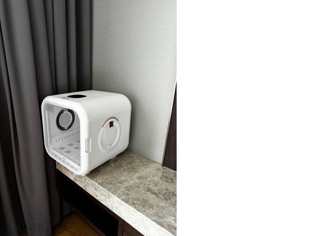 This modern cat dryer is designed to provide a stress-free drying experience for your feline friend after bath time. The appliance, shown beside grey curtains and resting on a marble countertop, boasts a sleek and compact white design, making it a stylish addition to any household. It features a transparent door for easy monitoring, a variety of control settings to adjust temperature and time for optimal comfort, and a well-ventilated interior space ensuring even airflow for quick and gentle drying. The secure latching system on the door ensures your pet's safety during the drying process.