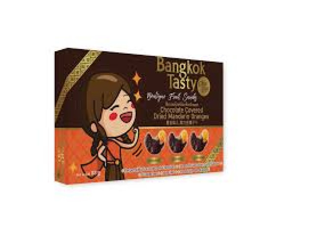 Bangkok Tasty offers a delightful treat with its chocolate-covered dried mangoes and tangerines. The packaging features a charming illustration of a smiling girl, adding a playful and inviting touch to the product. Inside, the fruit is coated in rich chocolate, creating a perfect balance of fruity sweetness and creamy indulgence. This unique combination makes it an ideal snack for those seeking a tasty and exotic treat.