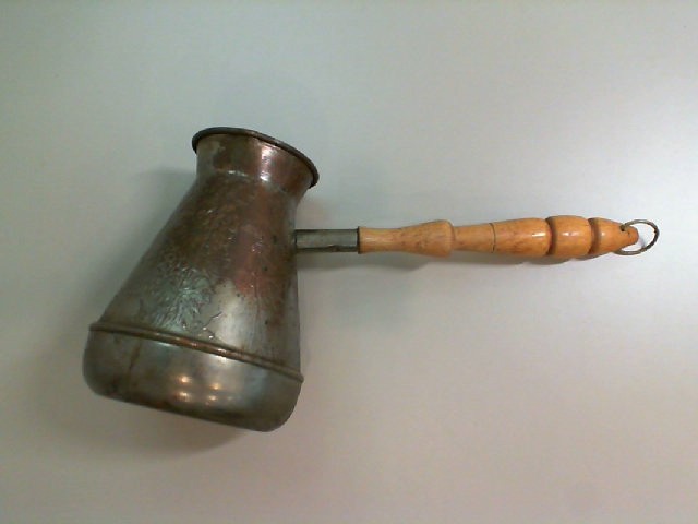 This is a traditional Turk, also known as a cezve or ibrik, used for making coffee. The image displays a vintage piece, likely made of copper, which is a material known for its excellent heat conductivity, crucial for brewing a perfect cup of coffee. It has a long wooden handle that provides a secure grip and keeps the hand away from heat. The body shows engraved decorative elements, adding a touch of elegance and authenticity to the item. Such a Turk is not only a functional kitchen tool but also a piece of cultural heritage and could serve as an interesting element of kitchen decor.