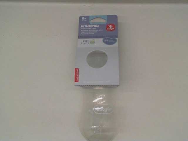 The BABY GO Baby Bottle is designed for infants starting from birth (0+ months). The bottle has a capacity of 250 ml, suitable for both milk and formula feeding. The transparent bottle allows caregivers to easily monitor the amount of liquid and ensures accurate measurements with clear volume markings. The ergonomic design of the bottle ensures a comfortable grip for both the parent and the baby. The product's packaging displays key information and the age suitability, making it convenient for purchasers to identify its appropriateness for their needs. Note that the nipple for the bottle is not visible in the image, and purchasers should verify whether it is included or needs to be bought separately.