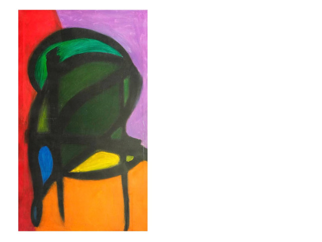 This vibrant painting of a parrot showcases abstract forms and bold colors. The artwork features a bright green body of the parrot, intricately outlined with black strokes to define its shape against a vivid background of orange, red, and purple hues. Splashes of blue and yellow add a playful touch, enhancing the visual appeal. The use of thick, textured paint creates depth, making the colors pop and draw the viewer's eye. This piece is perfect for adding a splash of color and a touch of whimsical charm to any space.
