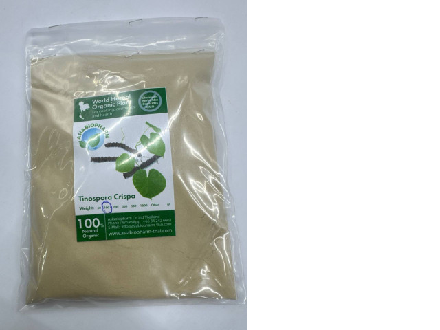 WORLD HERBAL ORGANIC PLANT Tinospara Crispa 100g is a dietary supplement derived from the Tinospora Crispa plant, known for its potential health benefits and nutritional properties. This organic product is carefully harvested and processed to ensure the highest quality and purity. It is suitable for various uses, including incorporation into cooking for enhancing flavor and health benefits. It may also be used in cosmetics and natural health applications. The fine powder is light beige in color and has a soft, smooth texture, adding versatility for different consumption methods. The product is packaged in a clear, resealable bag that preserves freshness and is marked with essential information for user convenience.