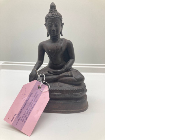This elegant souvenir figurine depicts a seated Buddha, a symbol of peace, harmony, and enlightenment. Crafted with attention to detail, the figurine features a serene expression, intricate hair curls, and traditional monk robes. The smooth finish and dark color of the material add to its sophisticated and timeless appearance. This item would make a meaningful gift or a special addition to a home decor collection, inviting a sense of calm and introspection wherever it is placed.