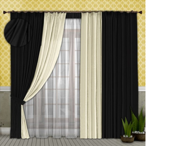 These elegant two-tone curtains present a sophisticated contrast with their black and cream color combination. The set includes a sheer white panel in the center that allows for natural light to gently filter through while still offering privacy. The black drapes provide a solid, grounding element that complements the softer cream panels. The thick drapery is ideal for creating a dramatic frame around your windows while also serving the practical function of blocking out light. The luxurious fabric adds texture and depth to any room's decor, and the coordinating tie-back on one side offers both functionality and a touch of decorative flair. These curtains are suitable for a variety of interior design themes, from modern to classic, making them a versatile choice for any living space.