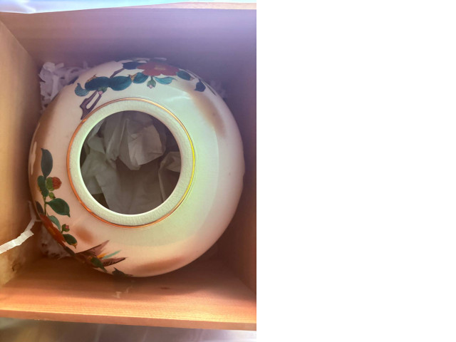 Ceramic pot with painted flowers and leaves, in a protective wooden box.