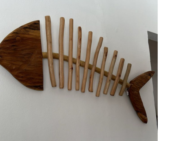 This Wooden fish figurine is a charming decorative element perfect for enhancing the ambiance of any room. Handcrafted from richly grained wood, the figurine features individual ribs that create a dynamic sense of movement, simulating the fish's fluidity in water. The alternating hues and tones of the wood give each piece a unique character, reflecting the natural beauty of its material. Its large size and the way it gracefully adorns a wall make it an eye-catching addition to any living space, office, or public area. This figurine combines rustic charm with a modern design sensibility, making it a versatile piece that complements a wide variety of decor styles.