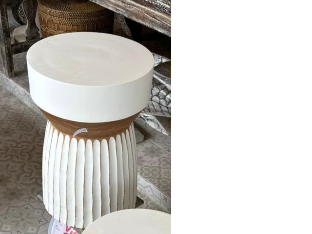 This striking wooden vase is a unique decorative element, featuring a distinctive brown and white co..