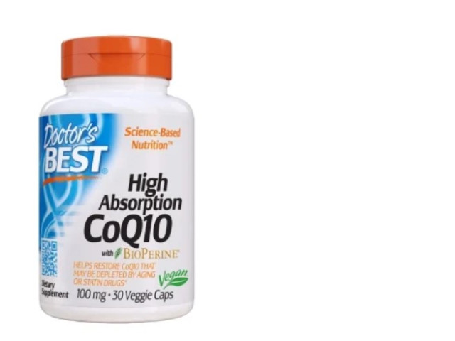 The provided image shows a bottle of Doctor's Best dietary supplement, named 'High Absorption CoQ10 with BioPerine'. It is a science-based nutrition product that promises high absorption and is marketed towards those looking for heart health support, suggesting it helps restore CoQ10 that may be depleted by aging or statin drugs. This product is suitable for vegans and comes in the form of veggie caps, with a quantity of 30 capsules at a dosage of 100 mg each. The packaging features a white bottle with a combination of blue and orange accents, which creates a reliable and professional appearance. The 'Vegan' label on the bottle indicates the product's compliance with vegan dietary standards. Please note that the actual product name and the requested translation do not match the image provided; therefore, the name in Russian is a direct translation of the requested product 'Doctor's Best Fisetin with Novusetin', which seems to be different from the CoQ10 product shown in the image.