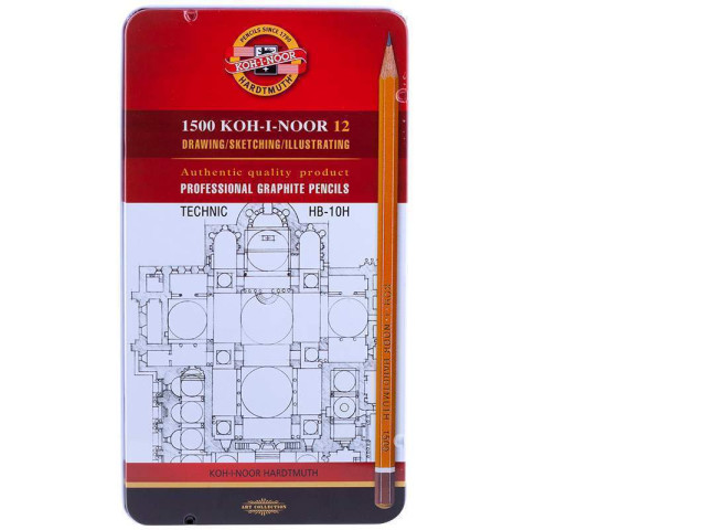 This set comprises 12 high-quality graphite pencils of assorted grades, ranging from hard to soft (HB through 10H), conducive for various drawing, sketching, and illustrating techniques. Encased in a sturdy metal box for protection and organization, this set is a part of the 'KOH-I-NOOR HARDTMUTH' collection, indicating a significant emphasis on quality and tradition since 1790. The visibly detailed blueprint design on the front of the box not only adds an artistic allure but also hints at the technical precision that this set allows for professionals and enthusiasts alike. This variety pack is ideal for any level of artist who appreciates authenticity and a range of tools for their craft.