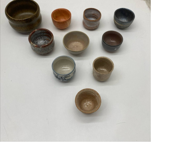 This set includes six uniquely glazed ceramic tea cups, each featuring a different color and texture..