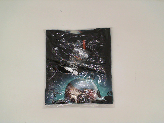 This black round neck t-shirt, presented in packaging, features a distinctive rock band pattern that..