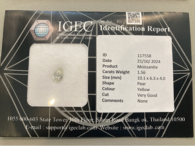 Moissanite 1.56 carats size 10.1*6.3*4.0 shape pear colour yellow cut very good