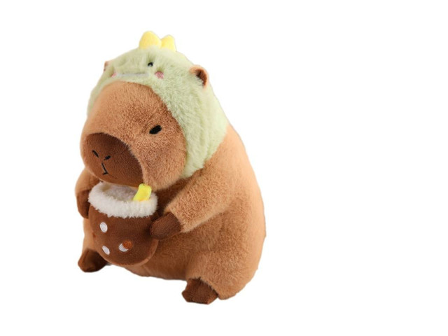 This adorable capybara doll comes adorned with a whimsical dragon hat, adding a playful and mythical twist to the plush toy. The soft brown fur of the capybara is crafted with attention to detail, featuring a kind face with delicate stitched features that evoke a sense of calm and friendliness. The dragon hat, complete with tiny spikes and contrasting pastel colors, sits snugly on the doll's head, providing a touch of fantasy. This plush represents a unique blend of natural and imaginary worlds, making it a charming gift for both children and adults who appreciate cute and imaginative toys. The capybara clutches a small, white and brown spotted mushroom, further enhancing its endearing qualities and making it a delightful companion for anyone.