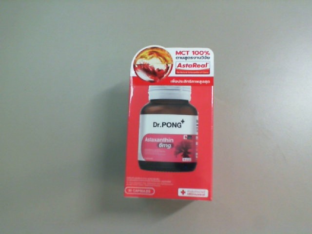 This product is a dietary supplement containing 30 capsules, each with a dose of 6mg of astaxanthin. The packaging prominently features the brand 'Dr. PONG' and has a red color theme, which could be indicative of the antioxidant properties often associated with astaxanthin. The package also mentions 'MCT 100%,' suggesting that medium-chain triglycerides are included, potentially offering additional health benefits. The AstaReal logo indicates that this astaxanthin supplement might use a specific, branded form of astaxanthin. The visible flame imagery reinforces the idea of potency and energy. Although the photo is slightly blurry, the key features are distinguishable and contribute to the product's appeal by highlighting its strength and premium ingredients.