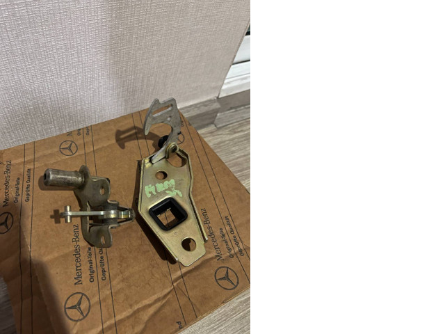 This lock set appears to consist of two key-operated locking mechanisms commonly used for automotive purposes, as inferred from the packaging branding. The set is constructed from what looks to be a durable metal, ensuring strength and reliability. One of the locks includes a handle component, suggesting that it may be used for securing and operating a vehicle door or compartment. The visorlike part attached to the handle is likely a support bracket to provide additional structural integrity when mounted. The patina and wear on the metal indicate moderate use, hinting at a potential for this set being a replacement part for a specific Mercedes-Benz vehicle model. The presence of a key in one lock suggests that they are ready for installation and immediate use. Detailed attention to the locking mechanism's build ensures security and ease of use, which are key selling points for vehicle owners seeking replacements or upgrades to their locking systems.