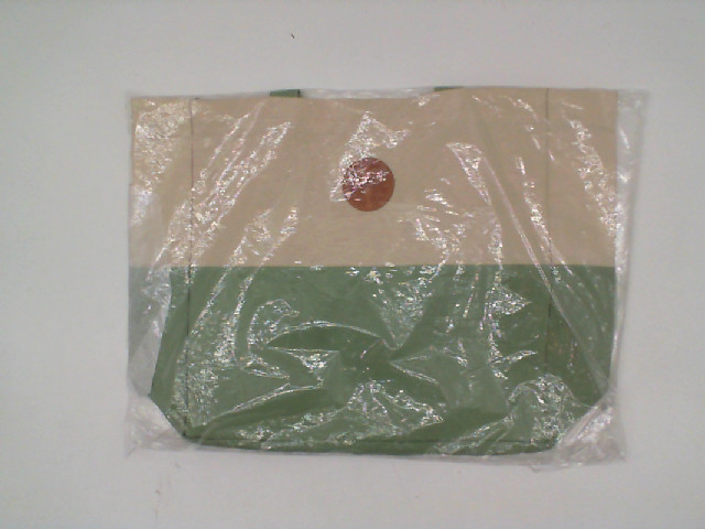 This is a cream-colored cloth bag that features a distinctive green pattern along the bottom. The bag appears to have a simplistic yet elegant design, with the green area possibly being a more durable material to provide additional support and protection to the contents. The green section is adorned with a subtle, leaf-like pattern, adding to its aesthetic appeal. It can serve as a practical accessory for carrying everyday items while also making a stylish statement. Due to the bag being wrapped in a clear protective plastic cover, this suggests it is brand new and has been kept in good condition. The closure mechanism of the bag is not visible, but there might be a button or other fastening element, as indicated by the small brown circle visible through the plastic on the front of the bag.
