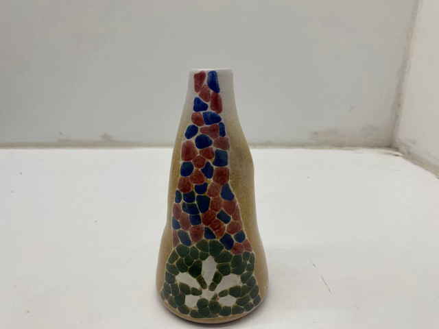 This large tall Japanese ceramic vase features a unique and vibrant design, showcasing a blend of colors including blue, green, and red. The intricate patterns resemble mosaic tiles, adding an artistic touch to its overall appearance. Its elegant, elongated shape draws the eye and makes it a perfect centerpiece for any room. The smooth ceramic finish enhances its beauty, while its robust structure ensures durability, making it an excellent choice for displaying floral arrangements or as a standalone decorative piece.