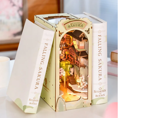 The DIY Booknook Sakura is a captivating miniature scene that transports you to a dreamy Sakura garden. Featuring delicate cherry blossom trees and enchanting lanterns, this creative project allows you to build your own serene reading nook. The intricate design showcases traditional Japanese architecture, complete with charming staircases and cozy corners. The add-on lighting enhances the atmosphere, creating a warm glow that beautifully complements the floral elements. Perfect for book lovers and craft enthusiasts, this book nook not only beautifies your bookshelf but also sparks the imagination.