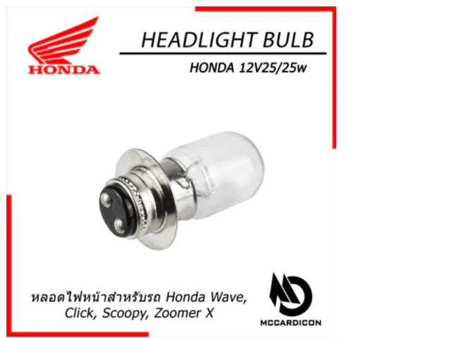Set of 4 headlight bulbs compatible with Honda Wave, Click, Scoopy, and Zoomer models. Each bulb operates at 12V with a powerful 25/25w output, ensuring optimal visibility on the road. The glass housing design combined with the sturdy metal base enhances durability, while the two contact points provide a secure fit. Designed specifically for Honda vehicles, these genuine replacement parts guarantee reliability and performance, making them essential for safe nighttime riding.