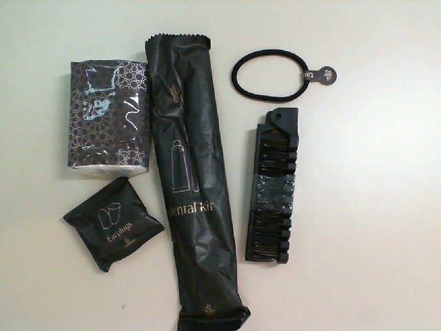 The 'Emirates hotel set' appears to include a selection of personal care items commonly provided by hotels for their guests' convenience. While the image quality is not high, we can discern several components in the set. These include a dental kit housed in a sleek black pouch, signaling a focus on oral hygiene. Additionally, a pouch labeled 'shoe mitt' suggests an item for shoe polishing, reflecting the set's consideration for the guest's attire maintenance. The set also contains a comb, packaged in a standard black holder, indicating attention to grooming. The presence of what appears to be a hairband also caters to the needs of guests who may require hair accessories. Overall, the set prioritizes practicality and personal care, with packaging that exudes a simple elegance reflective of the Emirates brand. These travel-sized amenities are likely designed to offer guests a touch of luxury and comfort during their stay.