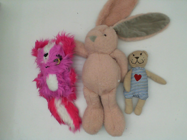 Introduce a world of fun and comfort with this Set of 3 Teddy Bears. Each plush companion features a unique design: a fluffy pink and white creature that stands out with its vibrant colors, a gentle beige bunny with oversized ears that exudes charm, and a small, adorable bear wearing a striped outfit with a heart patch, sure to bring smiles. Perfect for cuddling, these delightful toys are not only soft and huggable but also stimulate a child’s imagination and creativity. Ideal for playtime, bedtime, or as lovable decor for a nursery.