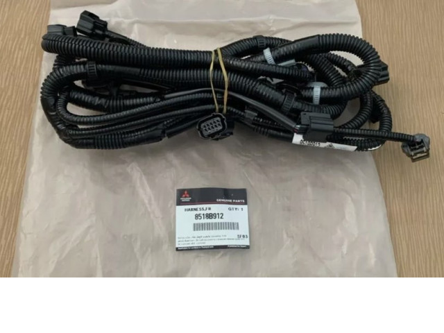 The GENUINE MITSUBISHI HARNESS for the front bumper, model number 8518B912, is an essential component designed for optimal vehicle performance. This wiring harness features a robust construction with flexible, durable black sheathing to withstand various environmental conditions. The connectors are designed for a precise fit, ensuring reliable electrical connections that enhance safety and functionality. This genuine part is ideal for maintaining the integrity of your vehicle's front bumper systems, ensuring uninterrupted operation of essential features like lights and sensors.