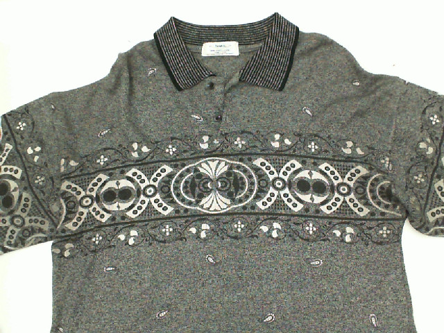 This dark grey short sleeve shirt features an elegant white and gold pattern, enhancing its sophisti..