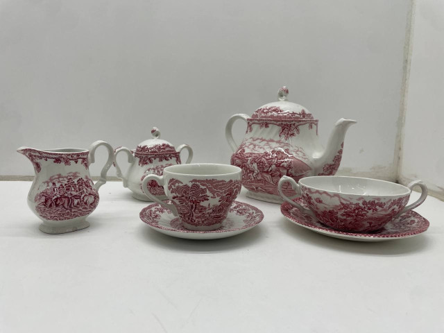 This elegant tea cup and saucer set features a striking red pattern that showcases intricate landsca..